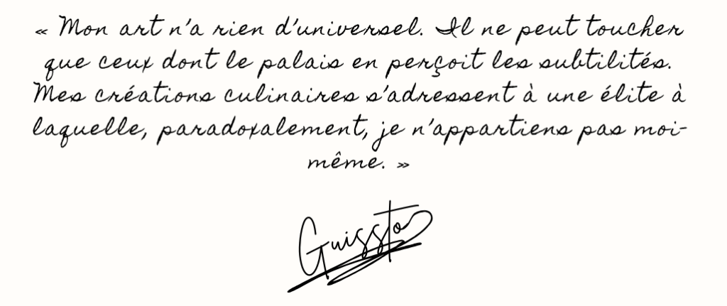 Guissto vous fait la proposition d’une cuisine simple, mais extrêmement raffinée, construite sur la base d’un ingrédient que vous ne saurez que trop apprécier. Parce que l’on ne vous sert que ce que vous méritez.